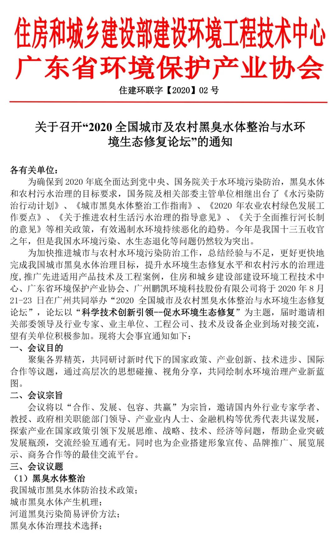 为加快推进城市与农村水环境污染防治工作,总结经验与不足,更好更快地完成我国城市黑臭水体治理目标,提升水环境生态修复水平和农村污水的治理进度,推广先进适用产品技术及工程案例,住房和城乡建设部建设环境工程技术中心、广州鹏凯环境科技股份有限公司将于2020年8月21-23日在广州共同举办“2020全国城市及农村黑臭水体整治与水环境生态修复论坛”,论坛以“科学技术创新引领--促水环境生态修复”为主题,届时邀请相关部委领导及行业专家、业主单位、工程公司、技术及设备企业到场对接交流。